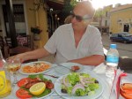 Découverte de Corfou-ville, une merveille vénitienne, avec des souks comme à Héraklion, des façades ocrées, des chats, un marché qui déborde de fruits mûrs et colorés, cerises, abricots ! Un petit café dans le marché qui propose de nous griller les poissons achetés sur l’étal en face , des musiciens de rue, des guirlandes colorées de linge dans les ruelles ! on approche des 36 ° …