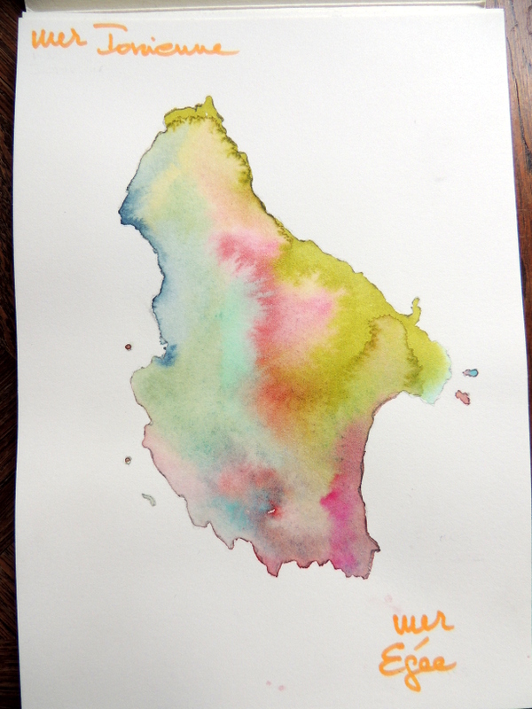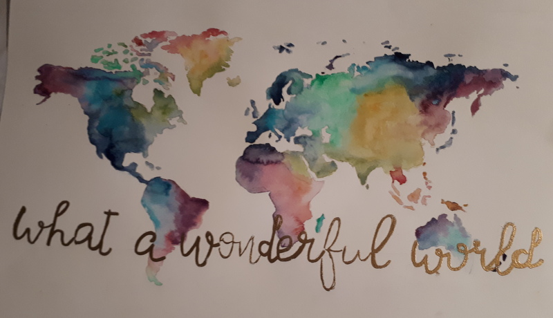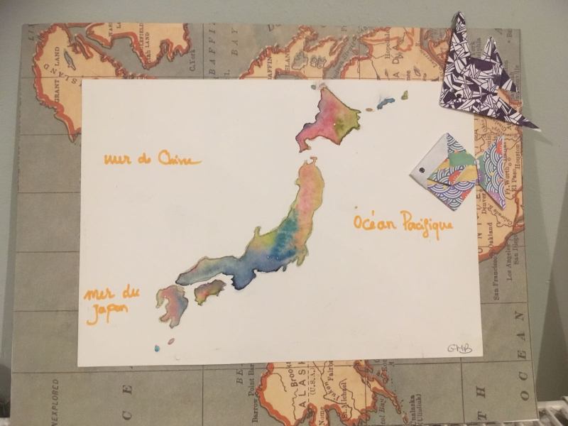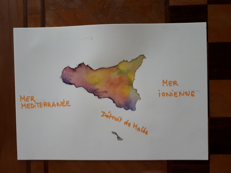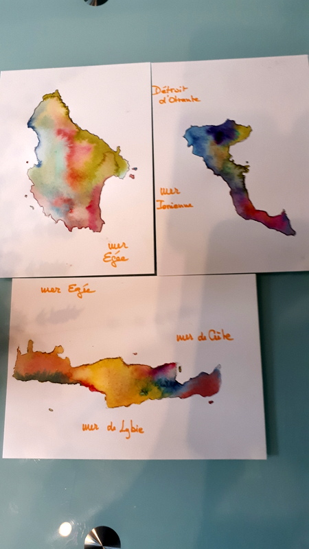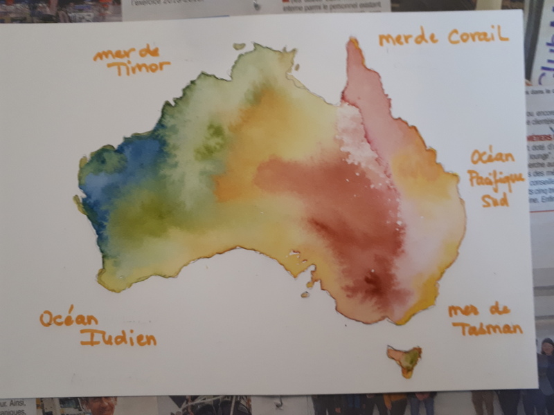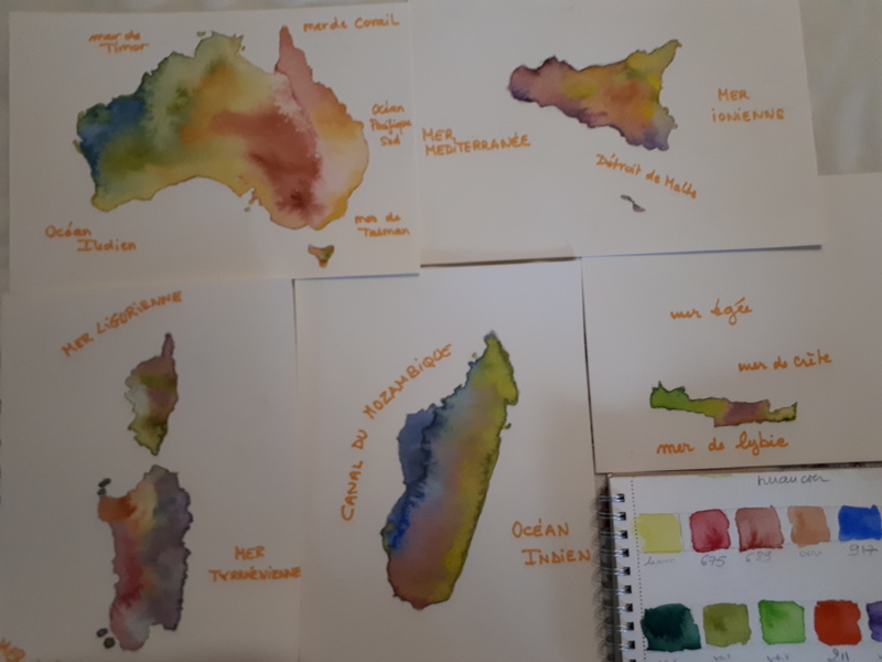 Pour commencer un stage d’aquarelle sur le thème du planisphère qui a duré 4 heures. Une première amorce de ce drôle de voyage dans la couleur…