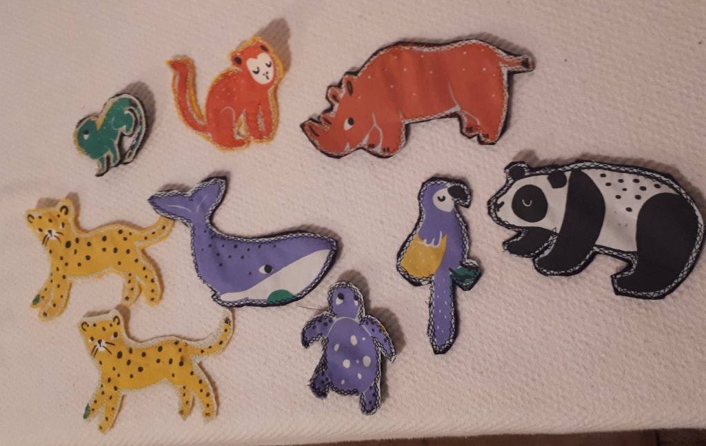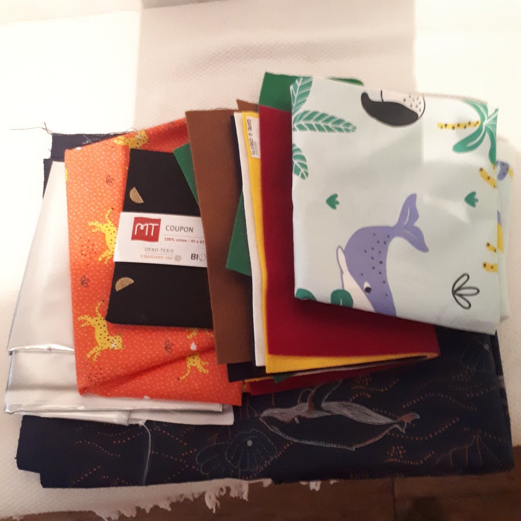 J’ai trouvé dans une des quatre merceries de la Rochelle, un tissu avec de grands motifs d’animaux plutôt exotiques dont je comptais découper les éléments pour un patching avec applications sur le fond, puis j’ai changé d’idée, ce seraient des personnages mobiles attachés au livre comme des marque-pages.