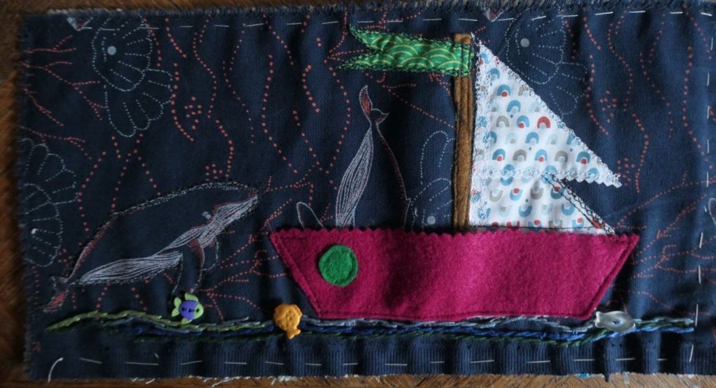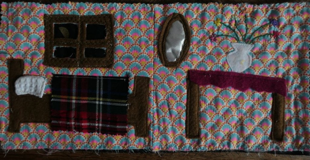 J’ai alors commencé à partir à la recherche de tissus pour le fond de chaque page, et de fil en aiguille, s’est tissée une sorte de scénario sans texte, avec des pages thèmes, la mer, la nuit, la chambre à coucher de l’enfant pour commencer .