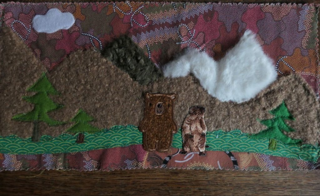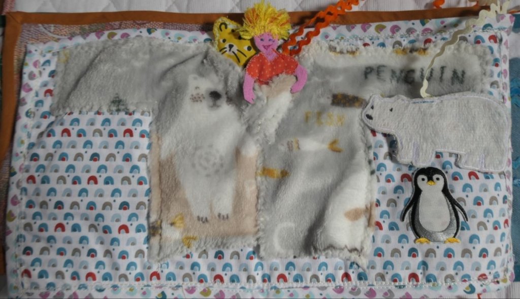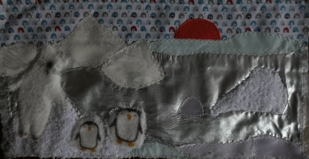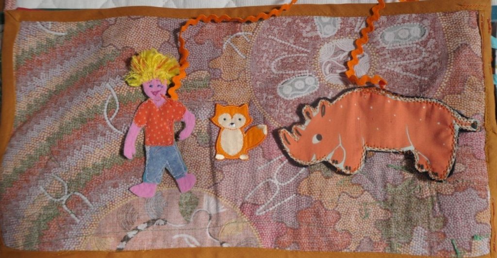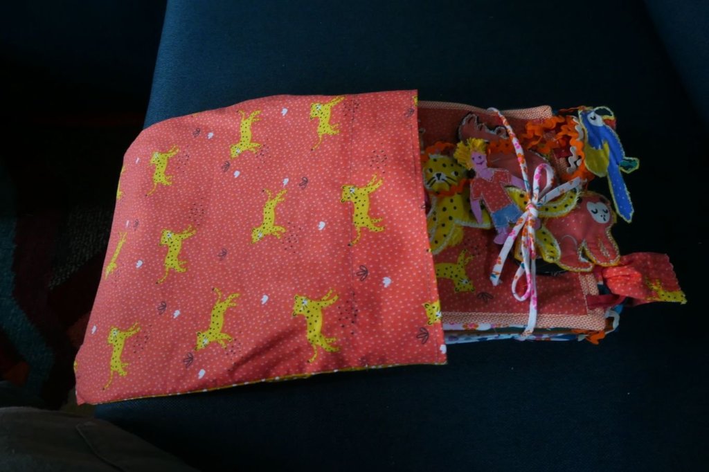 Le petit Mika alias le Caribou , pourra naviguer sur les pages du conte au fil de son propre récit de voyage, en choisissant d’y intégrer les animaux de son choix. Car il est lui aussi devenu personnage à part entière de l’histoire. Je l’ai fabriqué en le dessinant sur de la feutrine rose pâle, conçu et cousu des petits vêtements et perruque, broderie des yeux et de la bouche, j’ai pensé aux yeux bleus de sa mère et aux cheveux de son père… Thermocollé au verso pour la maniabilité.
