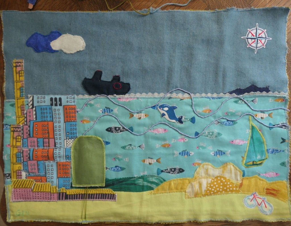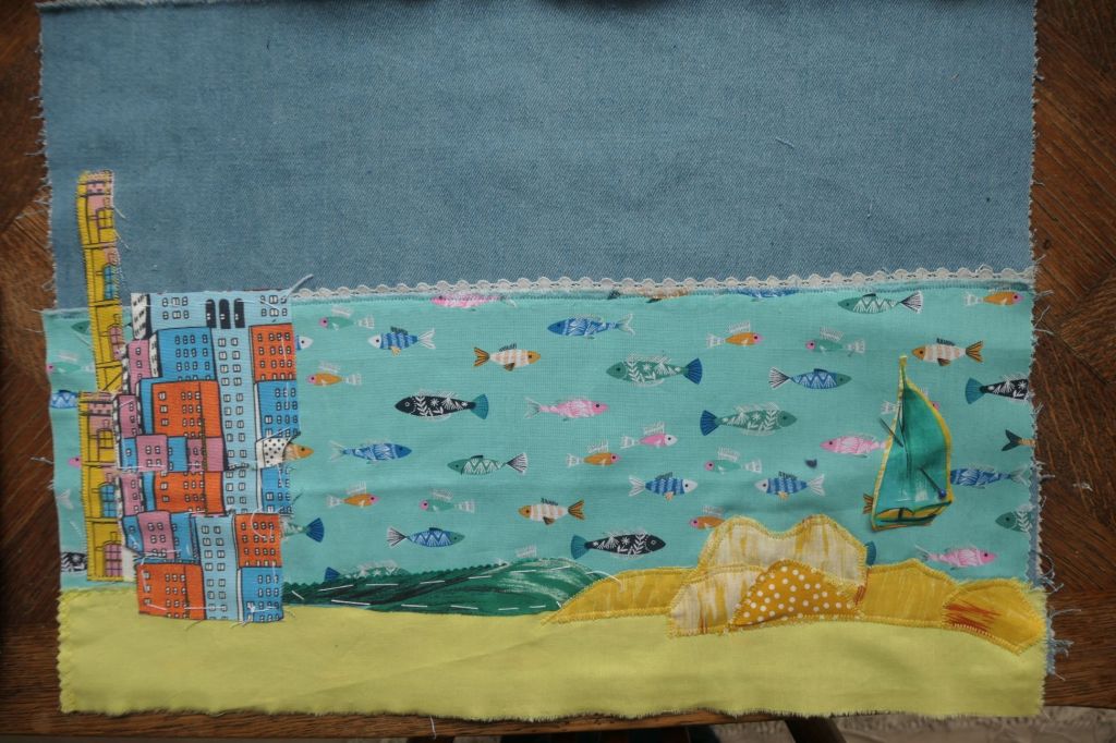 Je me suis amusée à faire d’abord un patching très coloré d’un tissu avec un imprimé de New York, un quartier de Brooklyn, et à le coudre sur un grand à plat de mer très poissonneuse.