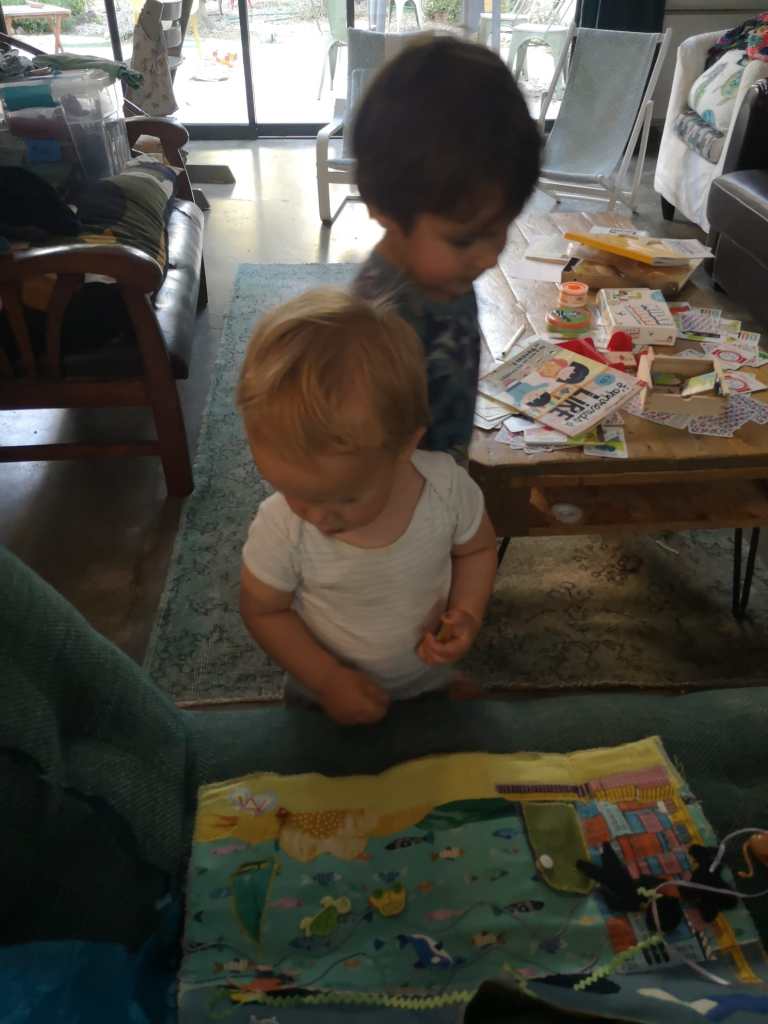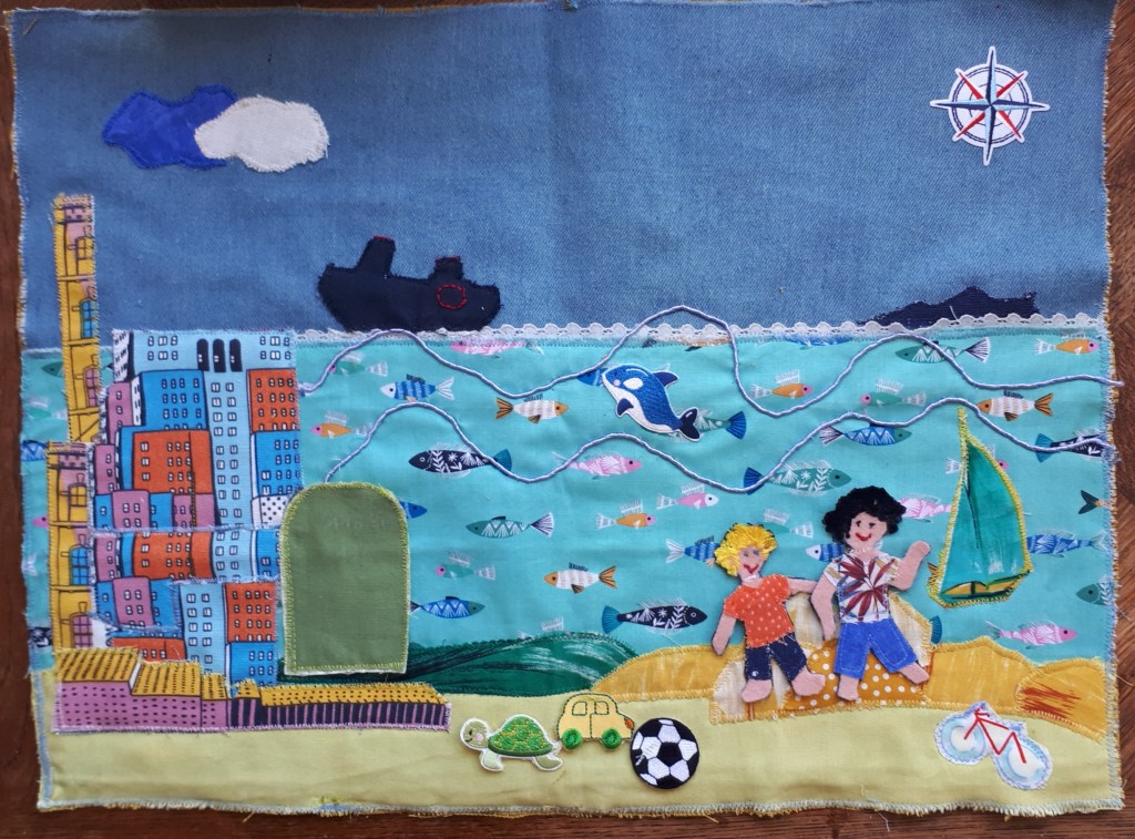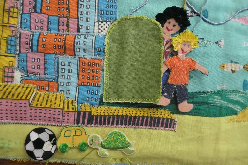 Ce tapis de conte, page textile pour évoquer le monde de Gaspard et Hugo: il s’agissait de rendre compte de leur ville, Marseille, comme terrain de jeu entre leur appartement et la plage, tout en surfant entre le cargo du papa et les plans d’architecture de la maman sur le mode Legos.