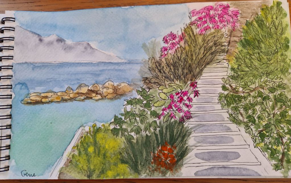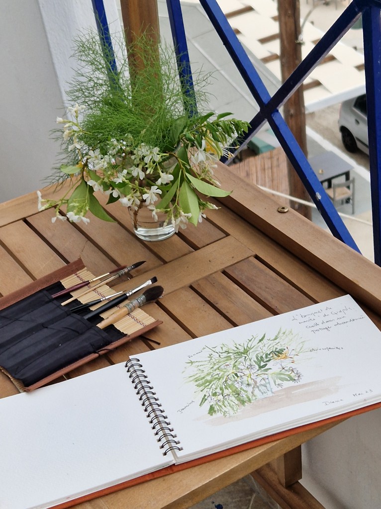 Puis nous descendons à Faros plus au nord, joli petit bourg avec une grande plage et de petits jardins potagers à l’abandon. Des citronniers qui ploient sous les fruits, des vignes redevenues sauvages . C’est là que je cueille un bouquet « de mariee » blanc improvisé avec du jasmin, du chèvrefeuille et du cerfeuil qui embaume . Plus tard je l’aquarellerai tant il m’inspire !