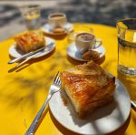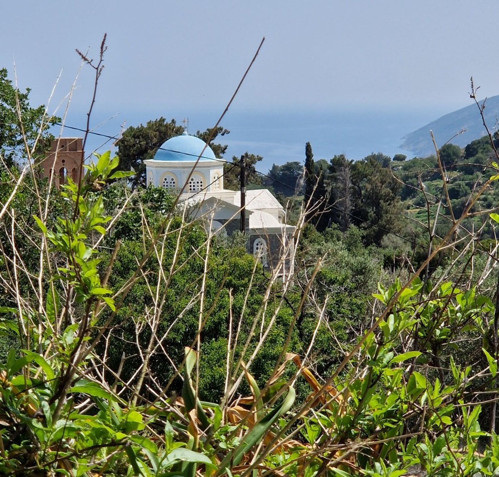 Nous arrivons au village d’Akramata bien plus haut. Sur la place un kafeneio sous les arbres, infiniment grec. Une dame de la poste qui arrive sans doute en voiture, s’attable et distribue des enveloppes et de l’argent en cash aux petits vieux qui arrivent doucement pour recevoir leur pension. Et nous dégustons pendant ce temps , de somptueux gâteaux crémeux faits maison, feuilletés parfumés à la mastika issue de la résine du lentisque pistachier qui pousse ici comme à Chios.