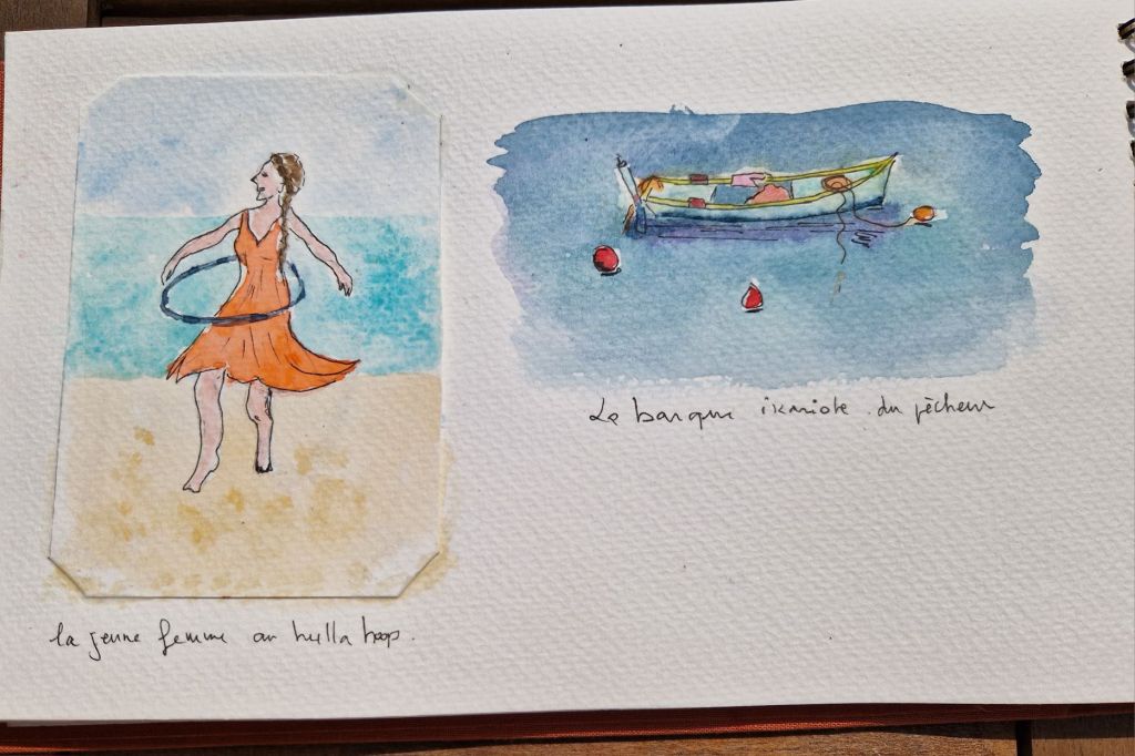 J’ai aquarellé de mon balcon une jeune femme très élancée, avec des tresses châtains, avec une robe orange, qui danse sur la plage avec son hoola hop qu’elle ne quitte pas , au son du bouzouki joué par des musiciens au restaurant l’Aura juste en bas.