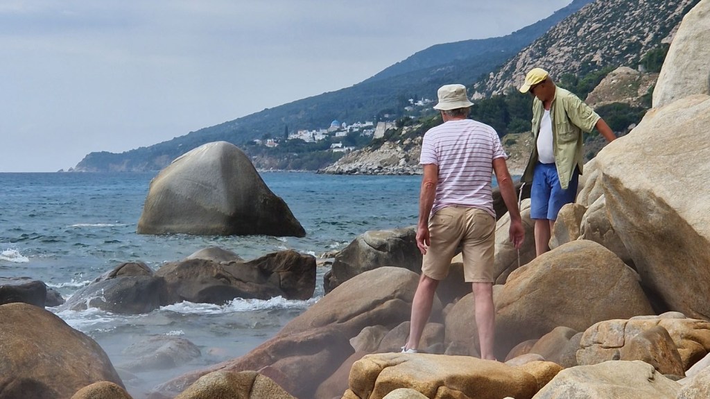 des locataires anglais très âgés sui jouent au jacquet dans le kafenio juste en face , good morning , good morning ! le monsieur porte un T shirt  » made in 1933″ humour anglais ! un couple de danois de Copenhague, que l’on croise, et surtout un couple de suisses de Bâle, Rosmarie et Péter que nous ne quitterons plus les derniers jours.