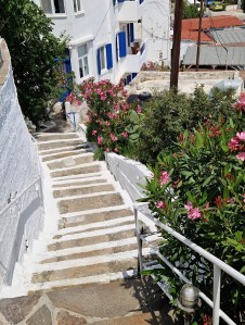 Des ruelles et des escaliers blanc et bleus dans le style cycladique, même si Ikaria n’appartient pas au cercle des Cyclades. Elle est à l’est de la mer Egee pas loin de Samos et des côtes turques.