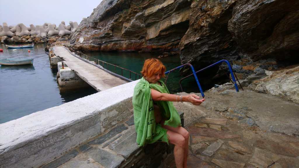 Tous ces gens partagent le même goût de la Grèce, une Grèce simple et vraie, au rythme scandé par le ziga, ziga! Doucement, doucement ! Le temps ici s’est arrêté, celui des montres, les bains d’eaux chaudes légèrement radioactives, guérissent de tout et on palabre dans la grotte dans toutes les langues.