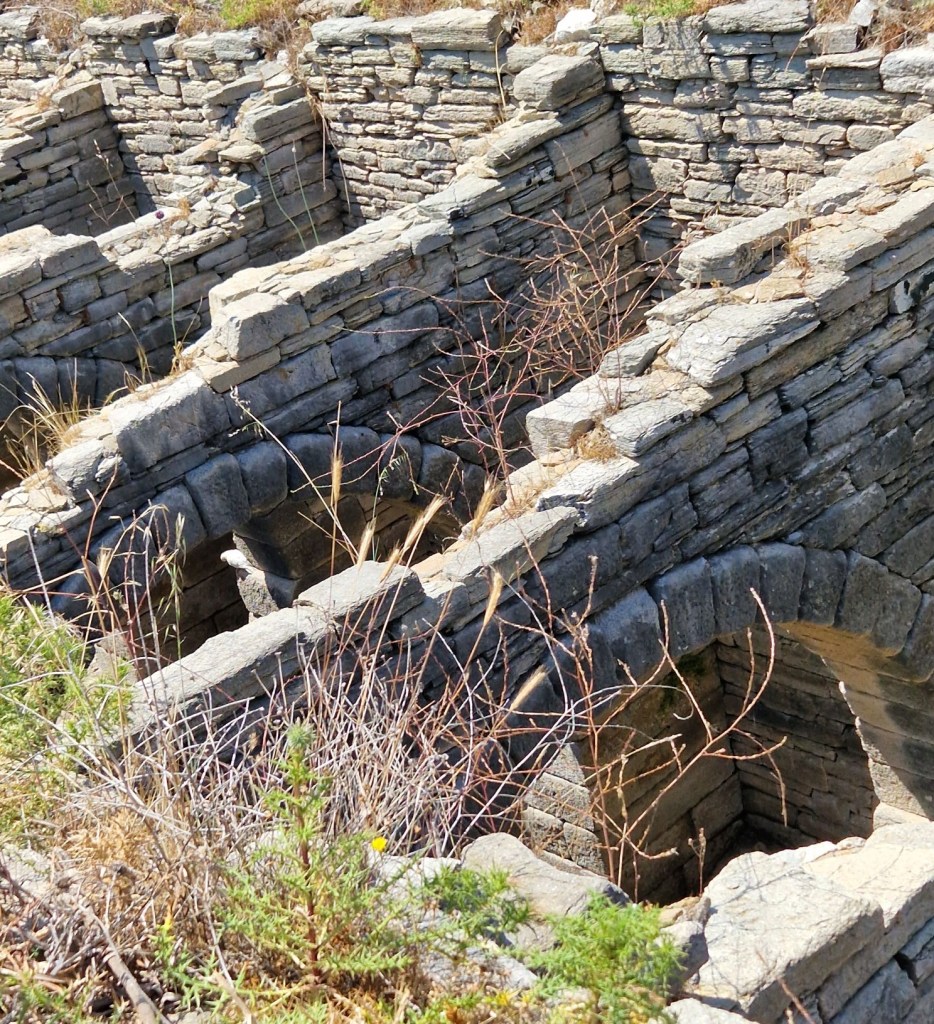 En suivant la rue qui monte vers le sud, on arrive à une terrasse avec la citerne du théâtre, construction impressionnante avec 9 compartiments reliés par de grands arcs.