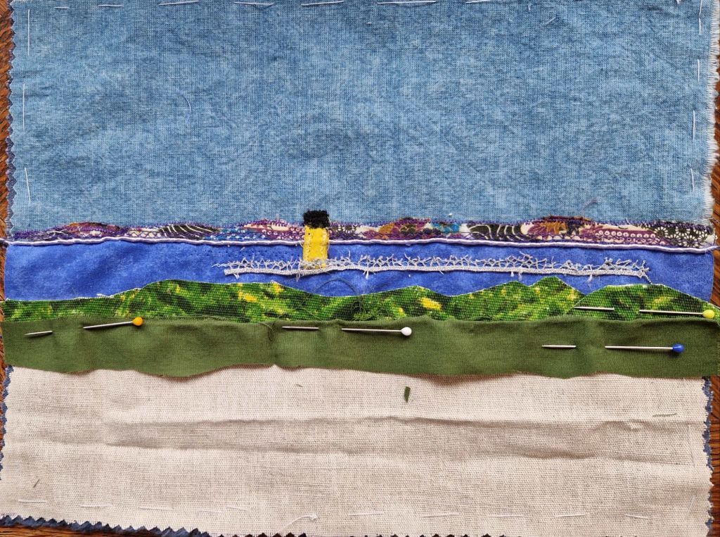 Le paysage se bâtit peu à peu, choix des tissus pour la végétation oleronaise, des épingles. Plus tard, le surfilage pour tenir le tout .