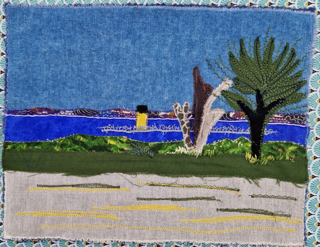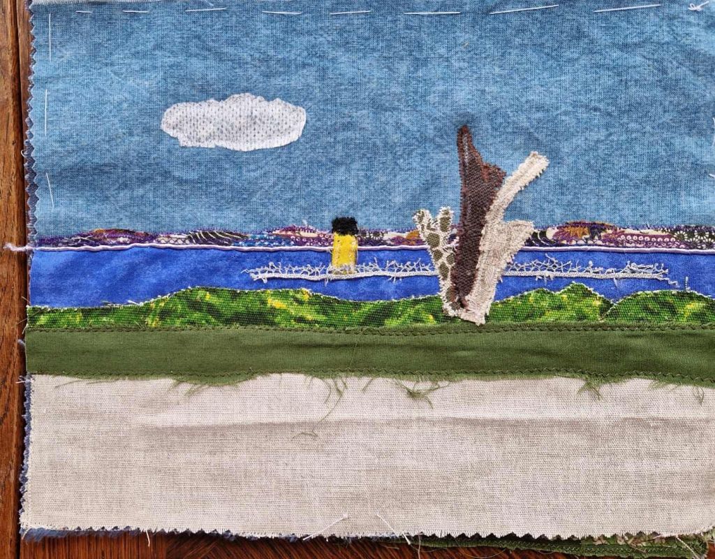 La ligne de terre à l’arrière plan représente le continent , j’ai choisi un tissus japonais très coloré, imprimé et découpé, bordé par une fine cordelette parme.