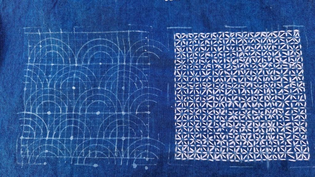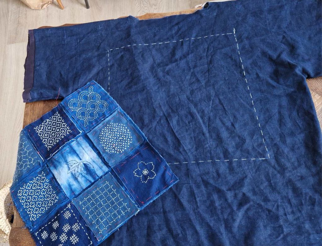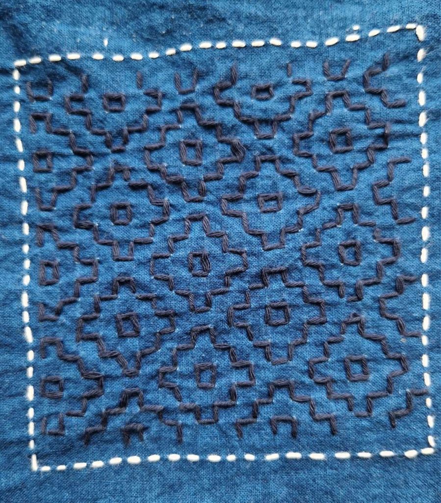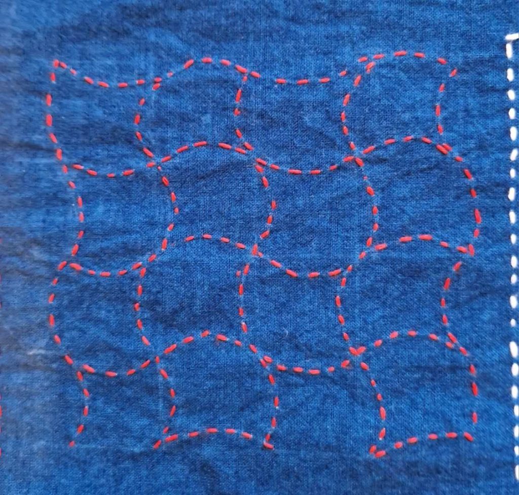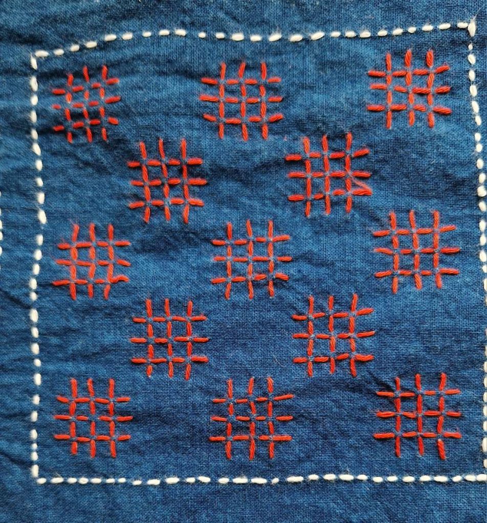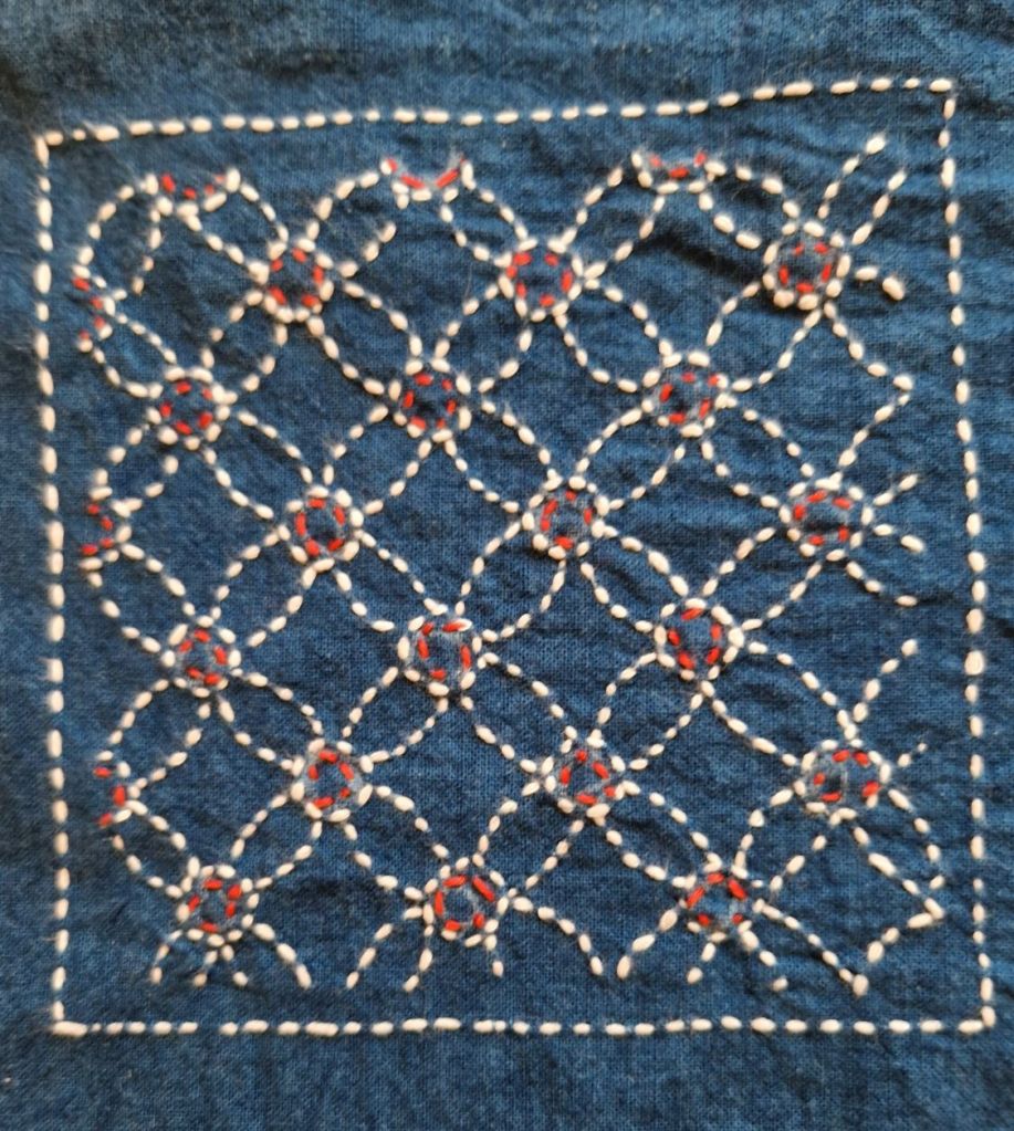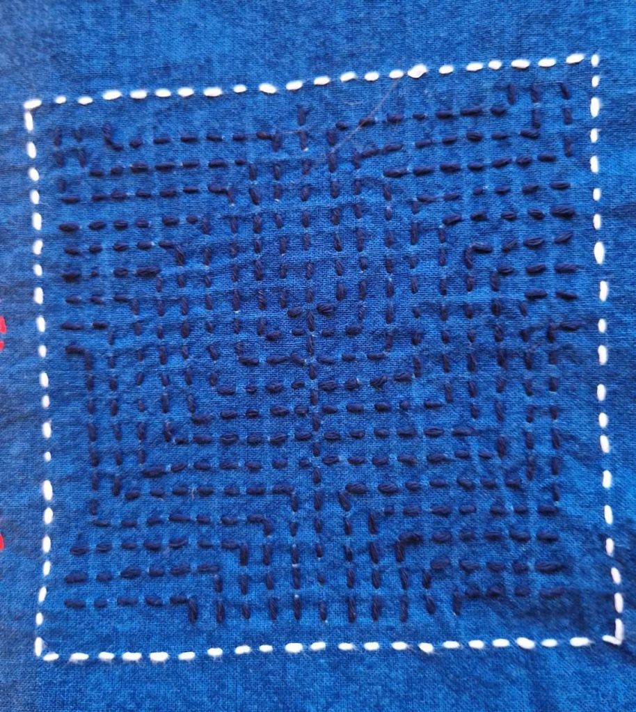 Je travaille actuellement à une pièce rectangle de tissu coton indigo, avec broderies de carrés de Sashiko avec variation des motifs et des fils de couleur. J’ai joué avec le fil de coton rouge.