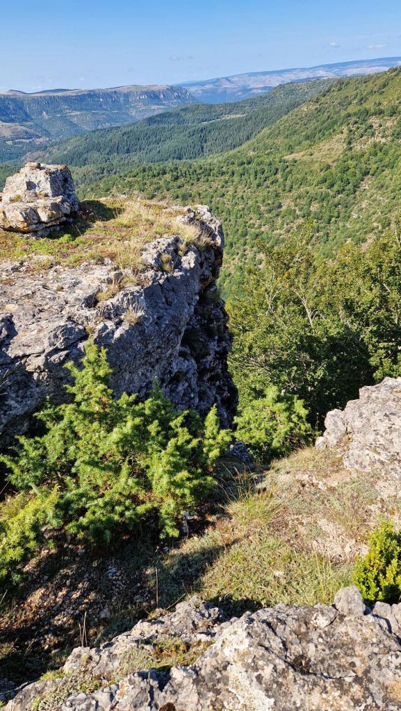 Et la seconde balade du jour, celle de l’après midi et la plus longue,nous emmène de la Can de l’Hospitalet sur des chemins en forêt, jusqu’à un point de vue magnifique sur les gorges du Taboul, la vallée du Tarnon et le Causse Méjan.