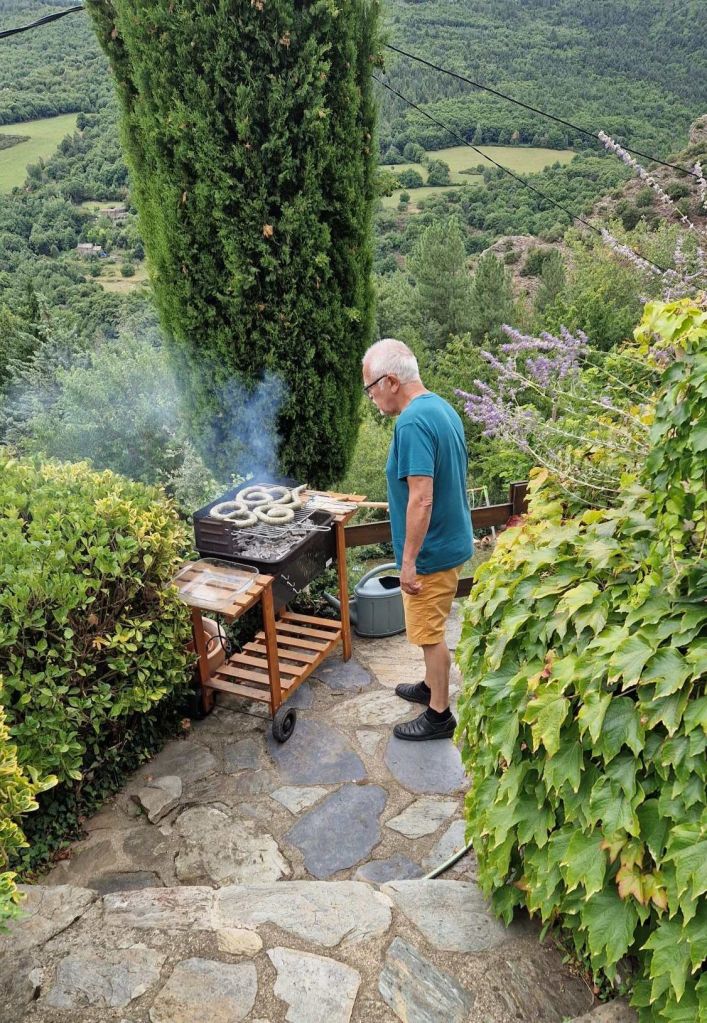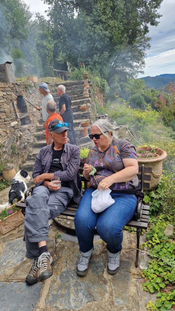 On repart pour le Pereyrol pour la journée…grillades, jeu de boules, déguisements, aquarelle sur le pouce, repas cevenol de nos hôtes, crochet et broderie sur tricot, album de photos familiales et lettres d’amour conservées, chansons hurlées et dansées dans une humeur joyeuse qui était celle de notre enfance … sans oublier les chœurs de l’armée rouge qu’Annie chante en russe, tout le monde n’a pas eu la chance d’avoir des parents communistes !