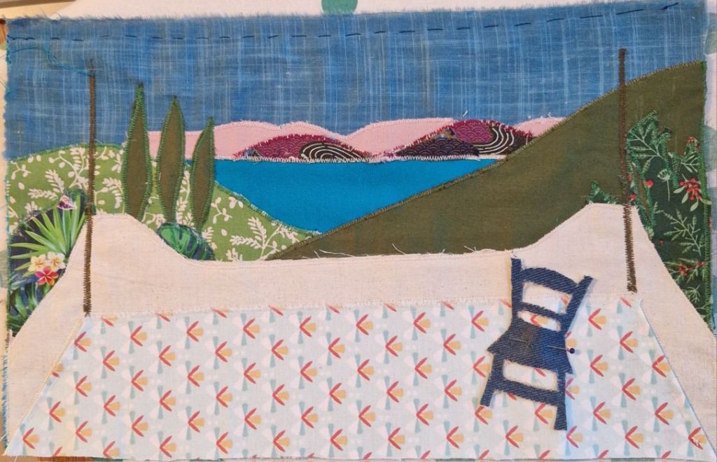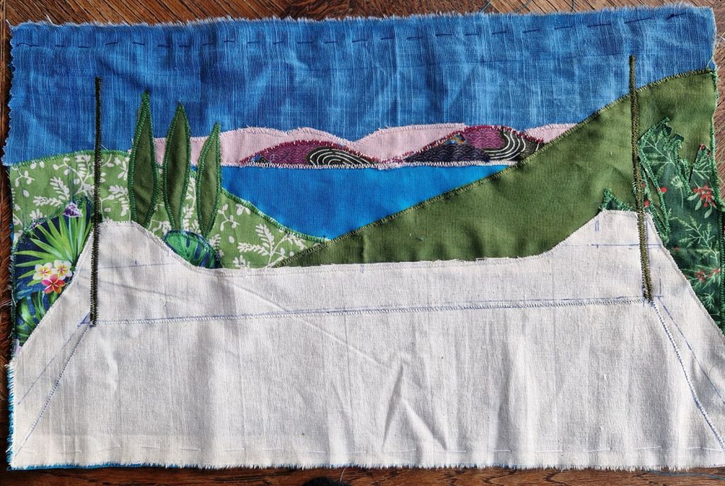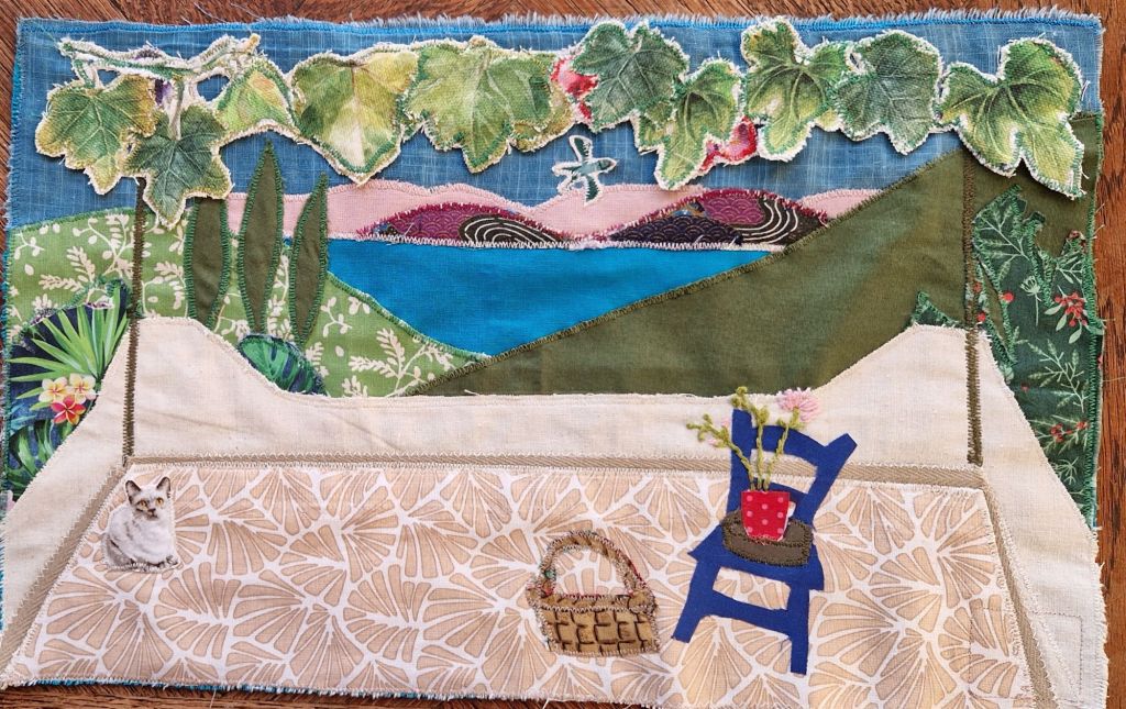 Michelle te voilà partie dans les limbes grecques et comme ton tremplin a toujours été ta maison perchée dans la montagne d’un petit village grec , avec une grande terrasse blanche plongeant sur le triangle bleu du golfe de Corinthe, j’ai cousu et brodé pour toi en hommage, ce paysage qui nous a tous enchantés et que l’on a partagé avec toi.