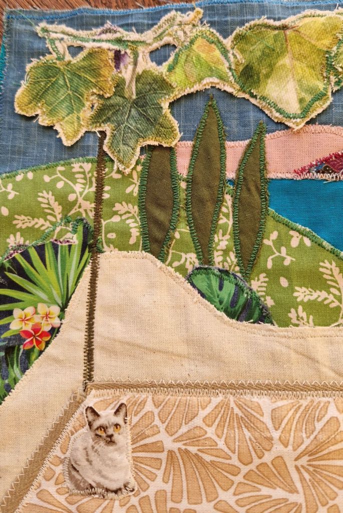 Entre temps j’ai fabriqué un chat blanc, cousu sur un tissu de sol plus crédible, L’ensemble se dessine bien !