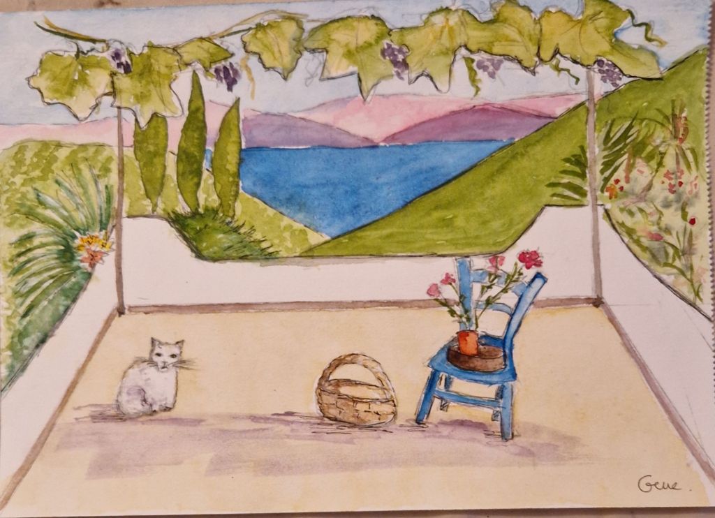 J’attaque le sujet du 1er plan , d’après une photo prise il y a une quinzaine d’années, sur cette même terrasse de Mamousia, la chaise bleue de Michelle, consignée dans mon petit bric- à- brac grec figurant dans ce blog.
